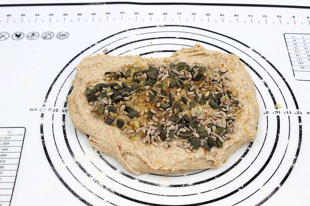 На подпыленную поверхность перевернуть тесто, немного растянуть, добавить семечки и жаренный лук.