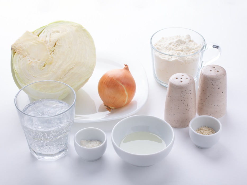 Подготовить все ингредиенты для постного заливного пирога с капустой. Отмерить нужно количество муки, можно заранее ее просеять. Не открывайте заранее минеральную воду, чтобы из неё не вышли газы.