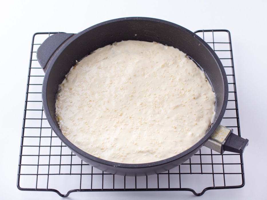 Залить капусту остальным тестом. Сверху посыпать кунжутом.