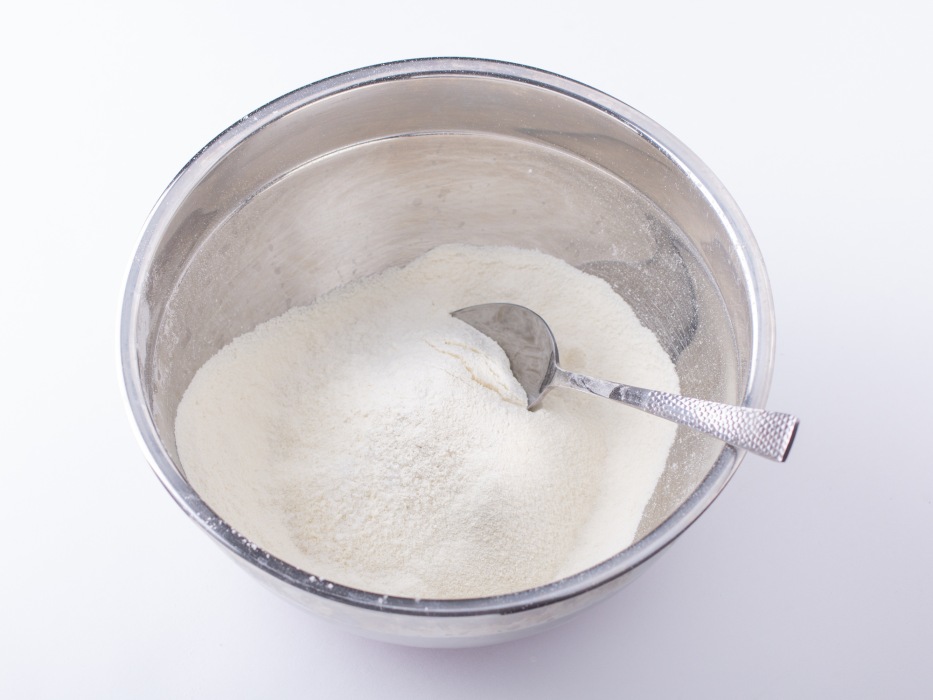Взять глубокую миску, насыпать в неё муку. Добавить соль и разрыхлитель. Все перемешать, чтобы ингредиенты распределились равномерно.