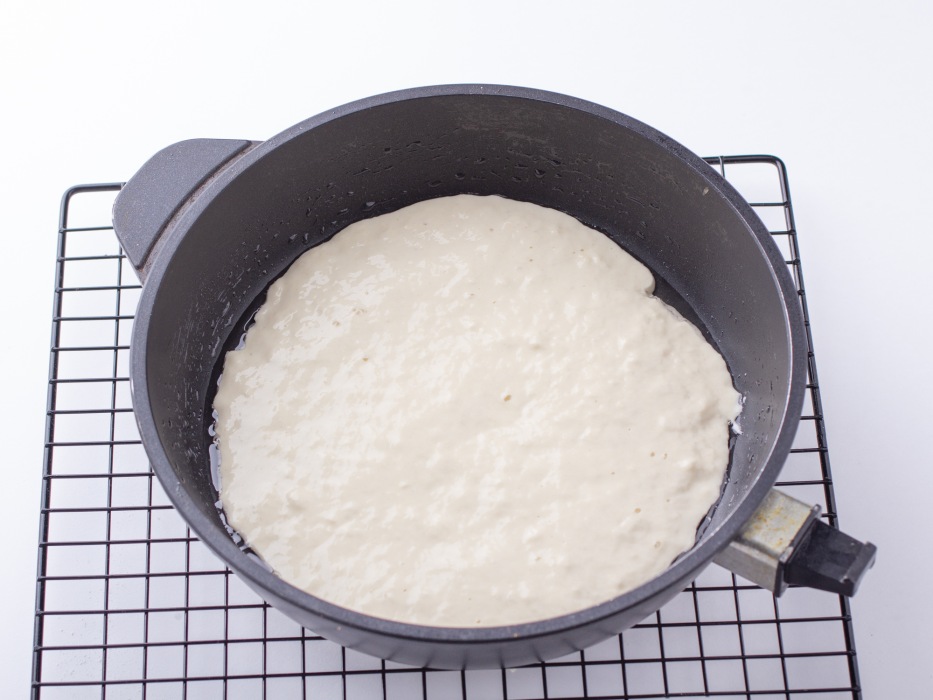 Форму для выпечки смазать растительным маслом. Используйте для этого кисточку. Если нет кисточки, то можно сделать это с помощью бумажной салфетки. Вылейте ровно половину жидкого теста. Разровняйте ложкой или силиконовой лопаткой.