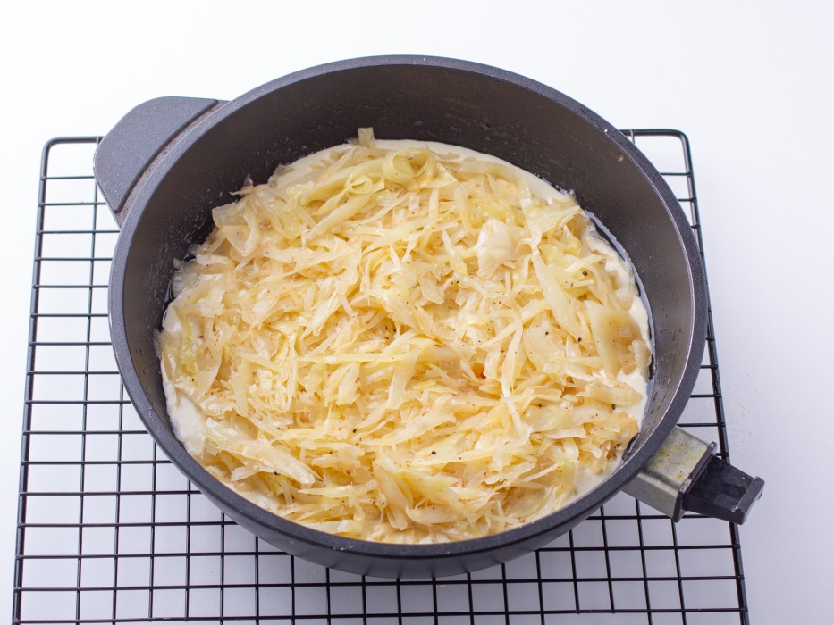 Выложить нарезанную капусту в сковороду к луку. Добавить соль и чёрный перец. Перемешать и убавьте огонь до минимума, накрыть крышкой. Тушите примерно 15 минут, помешивая каждые 3–4 минуты. Капуста должна уменьшиться в объёме, стать мягкой и не хрустеть. Снимите с огня и дайте полностью остыть (это важно, горячая начинка испортит тесто).