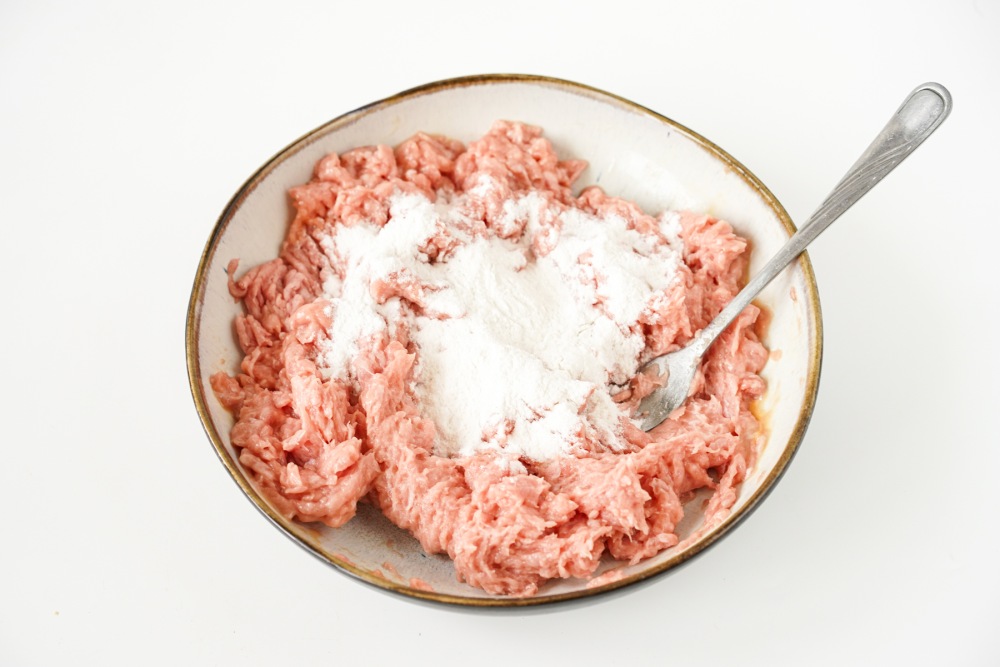 Насыпать нужное количество рисовой муки, постепенно вмешать её ложкой. Следить за консистенцией, фарш должен стать немного плотнее, но не сухим.