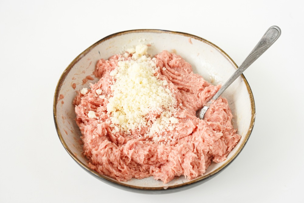 Добавить натёртый пармезан и тщательно перемешать, чтобы сыр равномерно распределился. Если сыр соленый, учитывать это при общем количестве соли в фарше. Перемешивать до однородности, пармезан должен дать аромат и лёгкую тягучесть при запекании.