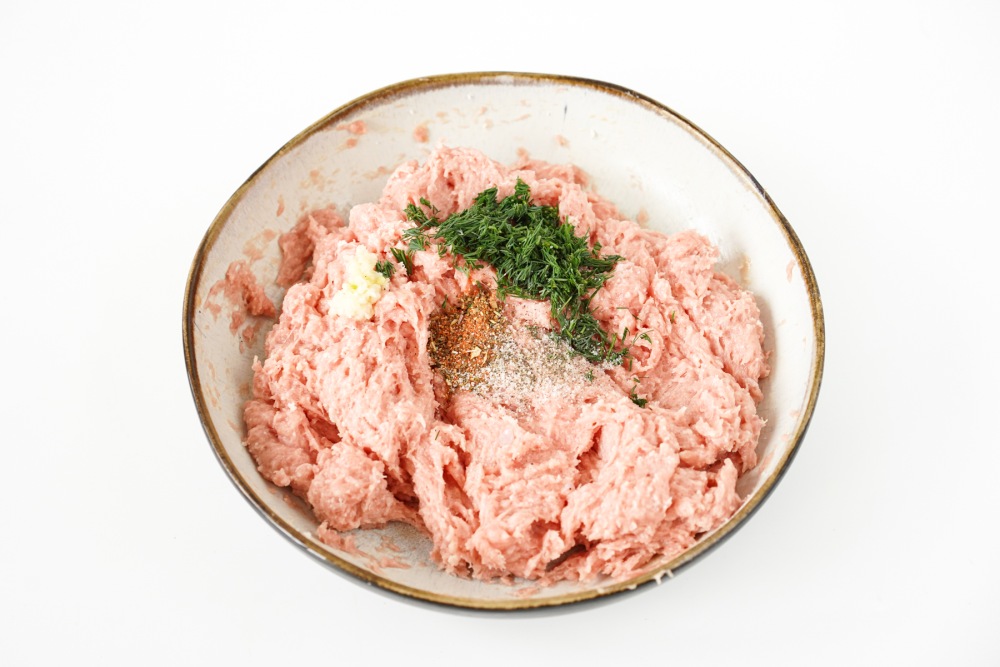Достать фарш из холодильника за 15–20 минут, чтобы он чуть согрелся и стал пластичнее, так его легче будет смешивать и лепить. Фарш выбрать без жира и прожилок. При желании подготовить его самостоятельно заранее из грудки или бедра индейки.