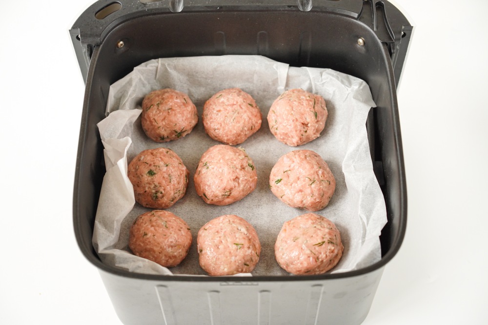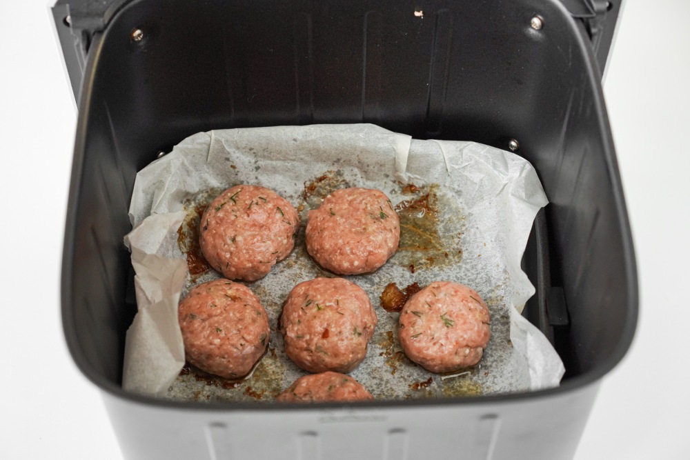 Застелить решётку аэрогриля пергаментной бумагой. Слегка смочить руки водой и сформировать котлеты одинакового размера. Взять примерно по 1–2 столовые ложки фарша, скатать шар и потом слегка приплюснуть. Укладывать котлеты из индейки на бумагу на расстоянии 2–3 см друг от друга, чтобы горячий воздух свободно циркулировал. Если фарш липнет к рукам, мочить руки чаще.