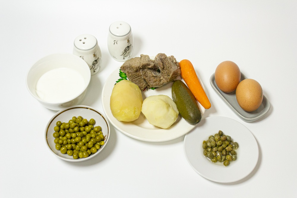 Подготовить нежирную говядину (лучше всего вырезку или кострец), морковь, картофель, консервированный огурец, зелёный горошек без сахара, яйца, натуральный йогурт без добавок или лёгкую сметану, каперсы по вкусу, свежую зелень, соль и чёрный перец.