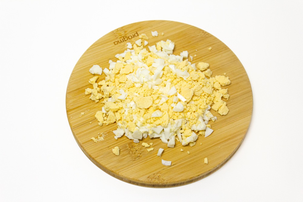 Сварить яйца вкрутую (около 10 минут после закипания), обдать ледяной водой, чтобы скорлупа очищалась легко и охладить. Очистить от скорлупы и нарезать маленькими кубиками.