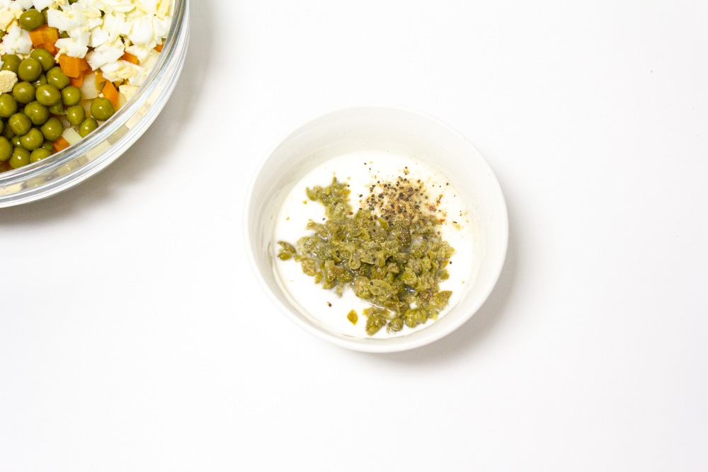 В отдельной чашке смешать сметану или натуральный йогурт, нарубленные каперсы, пару ложек маринада от каперсов и добавить соль, перец по вкусу.