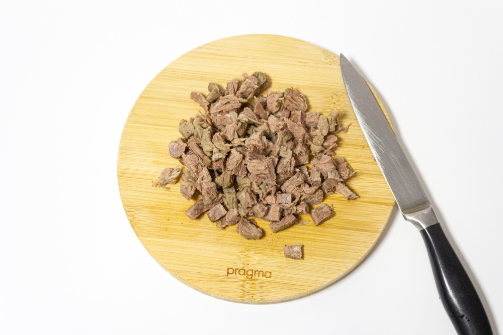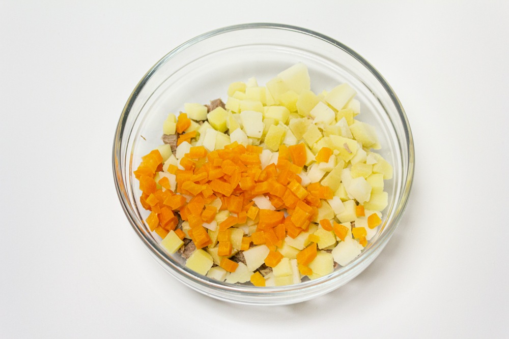 Отварить говядину до мягкости и остудить ее. Нарезать кубиками.