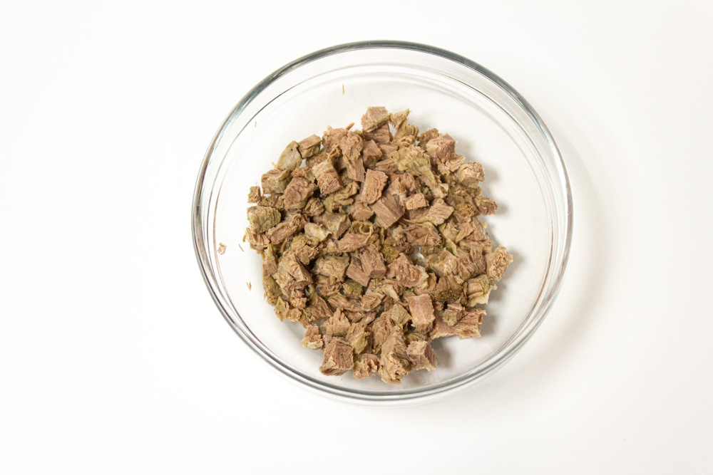 Отварить говядину в течение 1 часа на среднем огне/мощности в подсоленной воде с лавровым листом до мягкости. Остудить в бульоне (так говядина не станет сухой), нарезать кубиками.