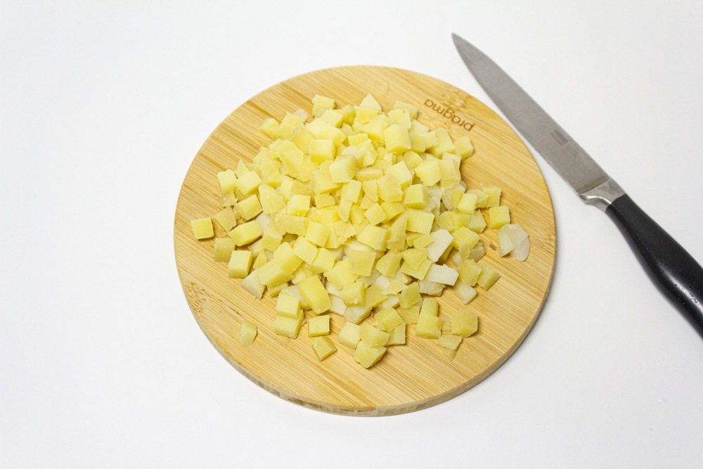 Картофель помыть и отварить в подсоленной воде в течение 20 минут (время зависит от сорта картошки), слить воду и остудить. Снять кожуру. Нарезать картофель кубиками.
