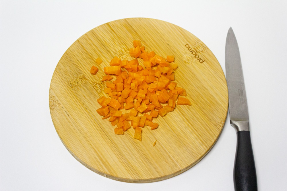 Отварить морковь в течение 20-30 минут на среднем огне/мощности в кожуре до готовности, остудить и очистить. Нарезать мелкими кубиками или натереть на терке.