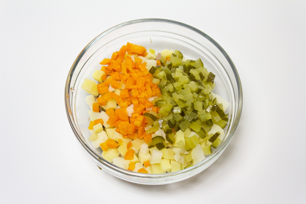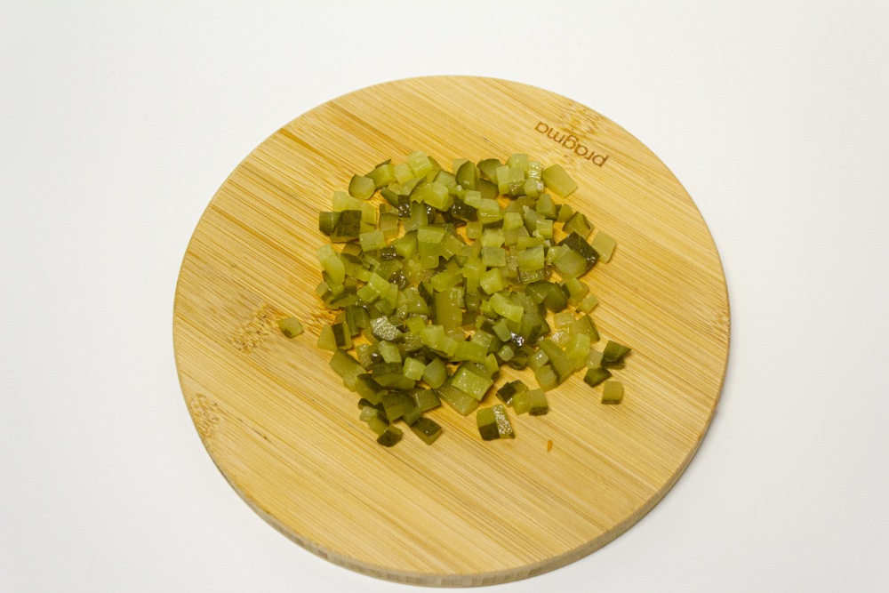 Нарезать соленый огурец маленькими кубиками, дать жидкости стечь.