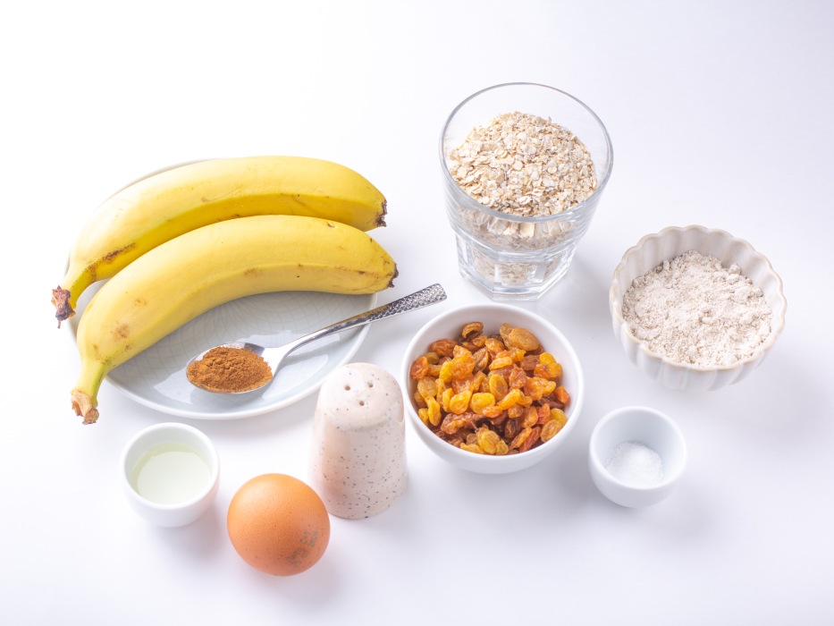 В составе нет ни грамма рафинированного сахара: сладость даёт спелый банан и изюм. Овсяная мука и хлопья это источник медленных углеводов и клетчатки, которая надолго дарит сытость. Одно яйцо и ложка масла связывают тесто, но не делают его жирным.