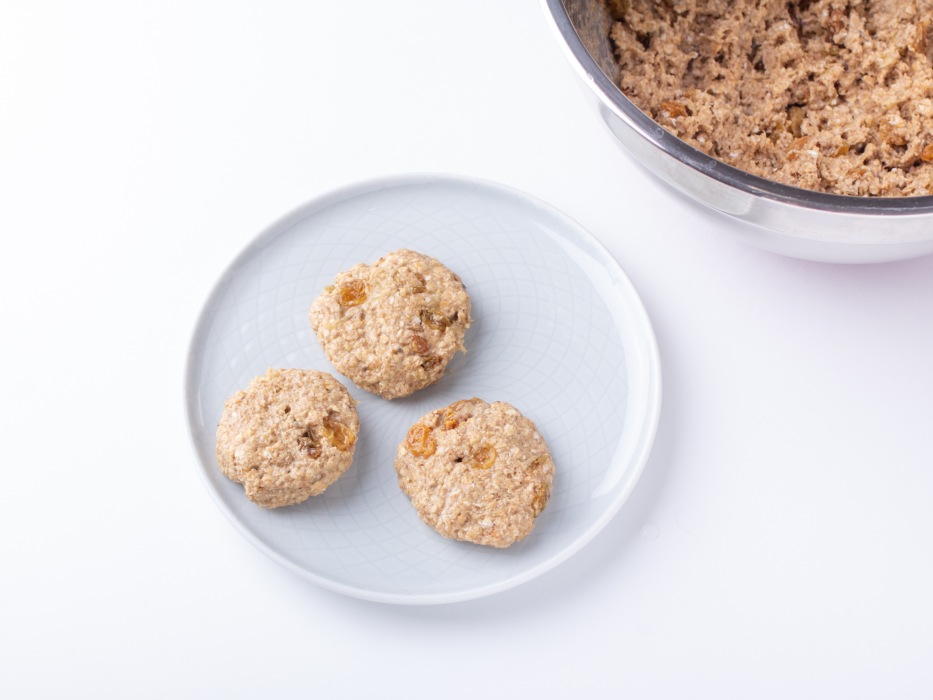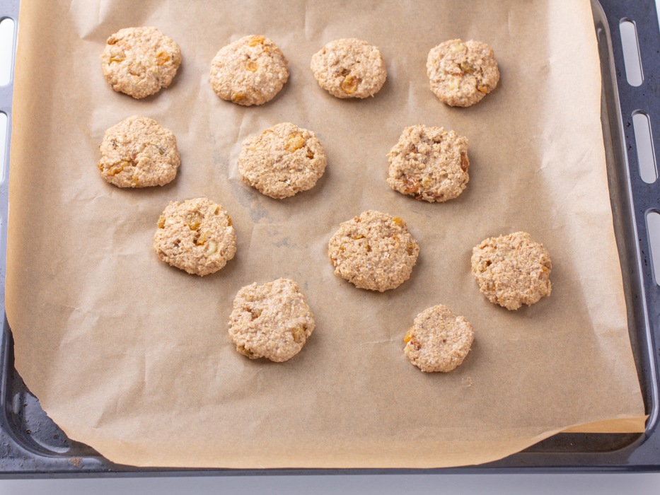 Руками, слегка смоченными водой (чтобы тесто не липло), сформировать из теста небольшие круглые печенья одинакового размера.
