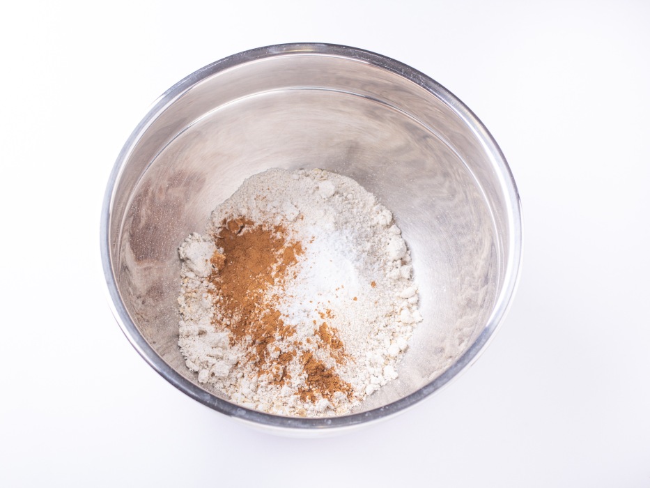 В миску насыпать овсяные хлопья, овсяную муку, разрыхлитель, корицу и щепотку соли. Все перемешать.
