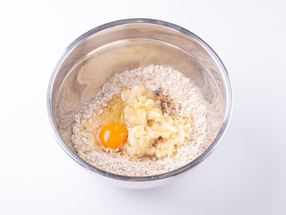 В миску с сухими ингредиентами добавить банановое пюре, яйцо, растительное масло.