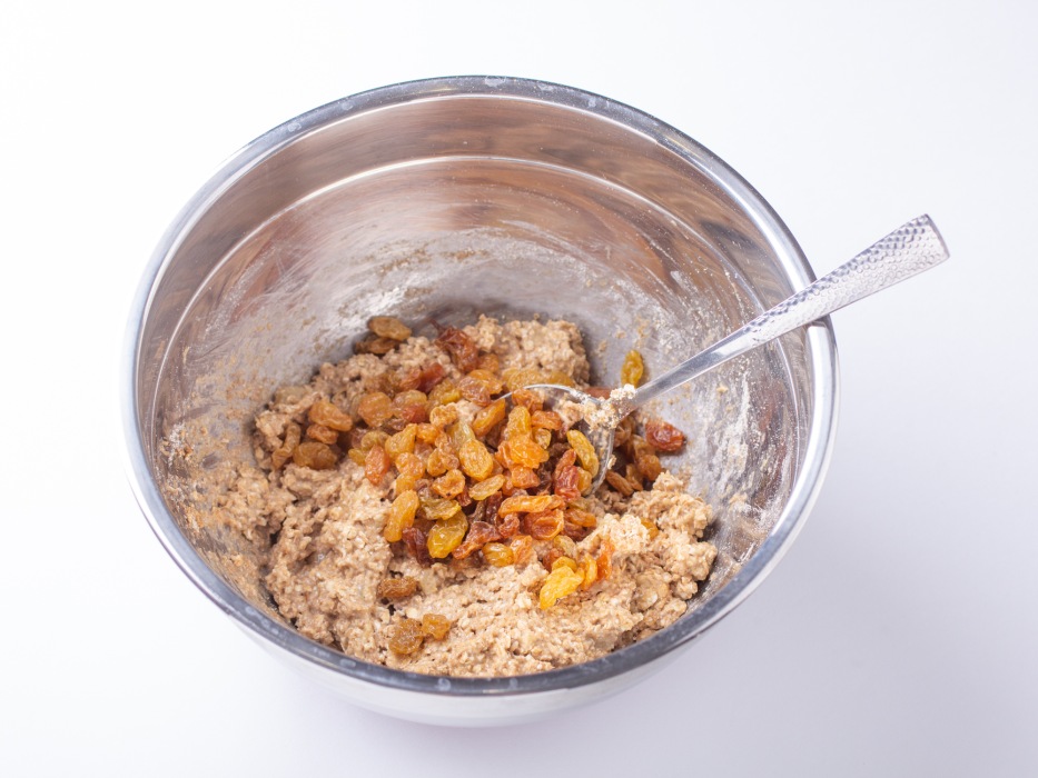 - Добавить изюм в тесто и перемешать, чтобы он равномерно распределился.