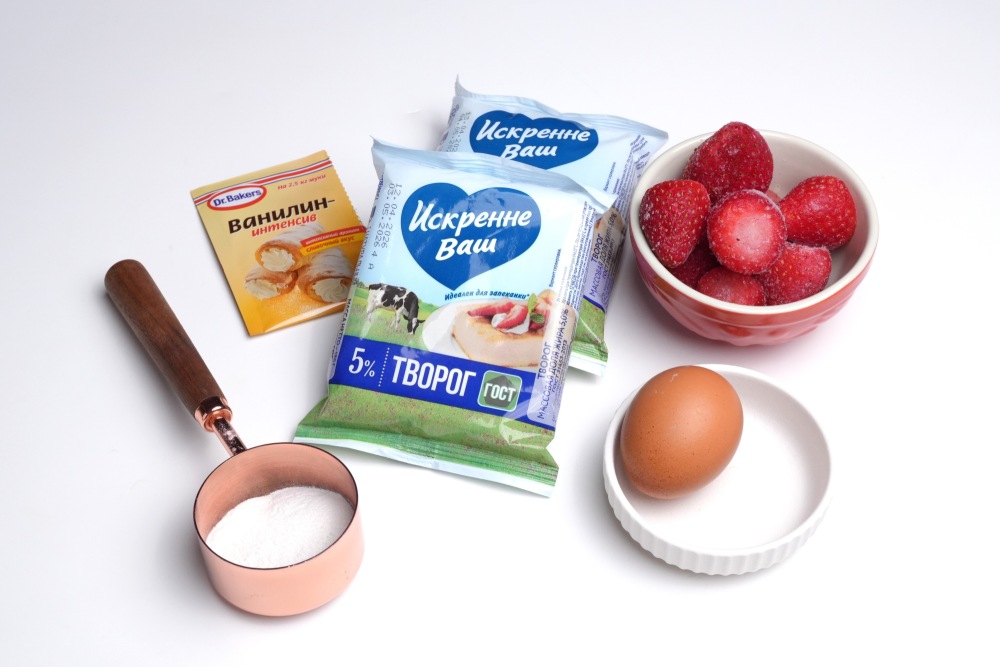 Подготовить все ингредиенты для приготовления. Желток отделить от белка. Творог должен быть полностью разморожен.