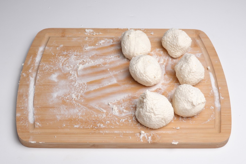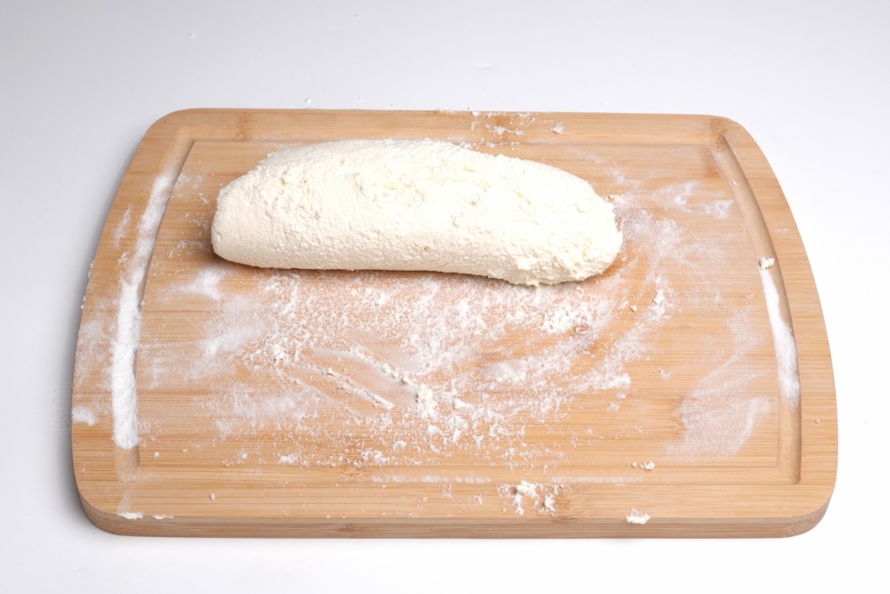 Поверхность для раскатки присыпать мукой. Тесто обмять, чтобы было однородным, и скатать в толстую колбаску.