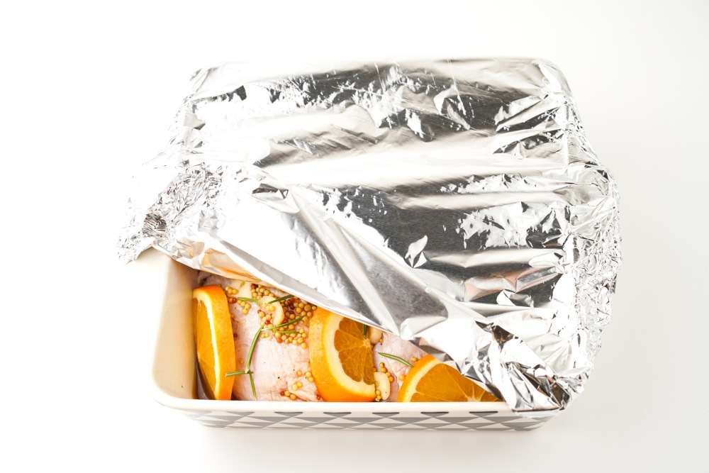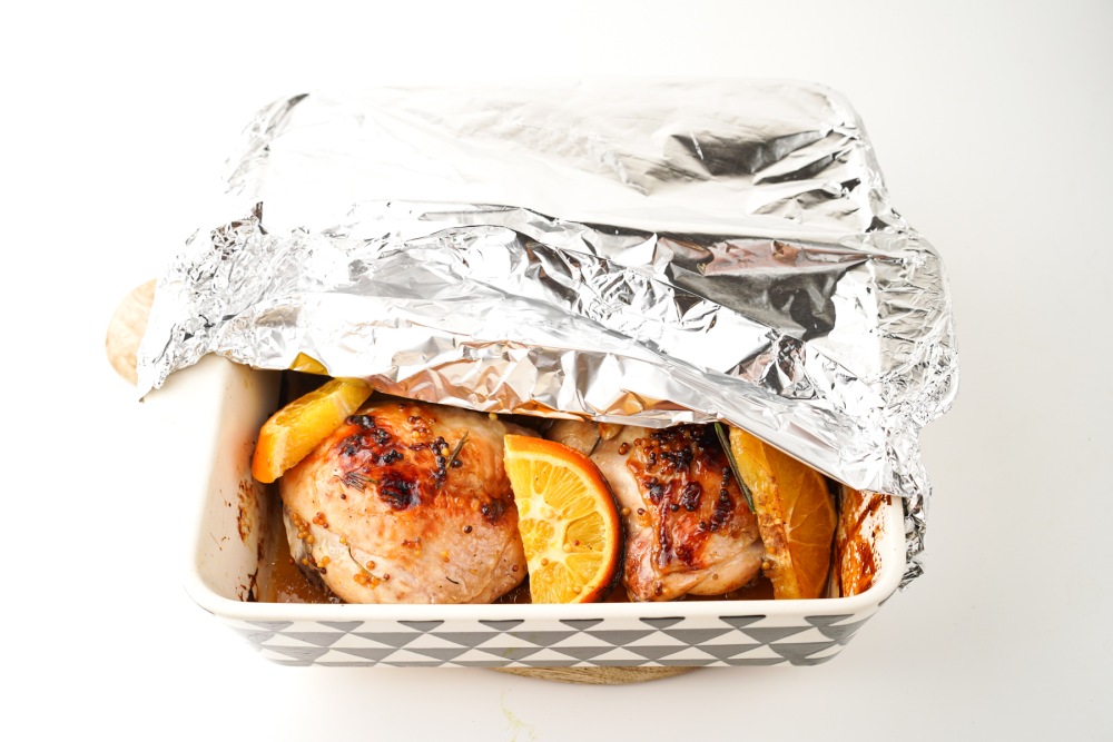 Накрыть фольгой. Запекать курицу в апельсиновом маринаде в духовке 40-60 минут при 180 градусах.