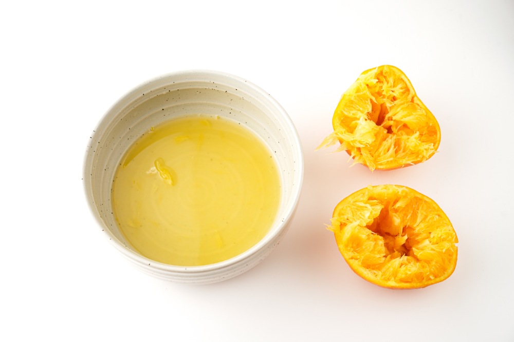 Выжать сок одного апельсина в глубокую миску, стараясь не допустить попадания косточек. При желании процедить сок через сито.