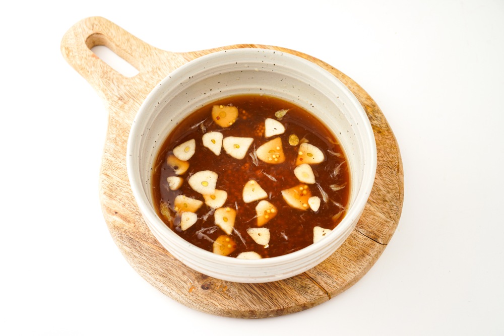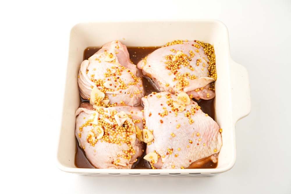 Нарезать чеснок тонкими слайсами или мелко порубить ножом, добавить его к апельсиновому соку. Влить соевый соус, добавить горчицу, добавить соль и при желании немного чёрного перца. Хорошо перемешать, чтобы маринад стал однородным и ароматным.