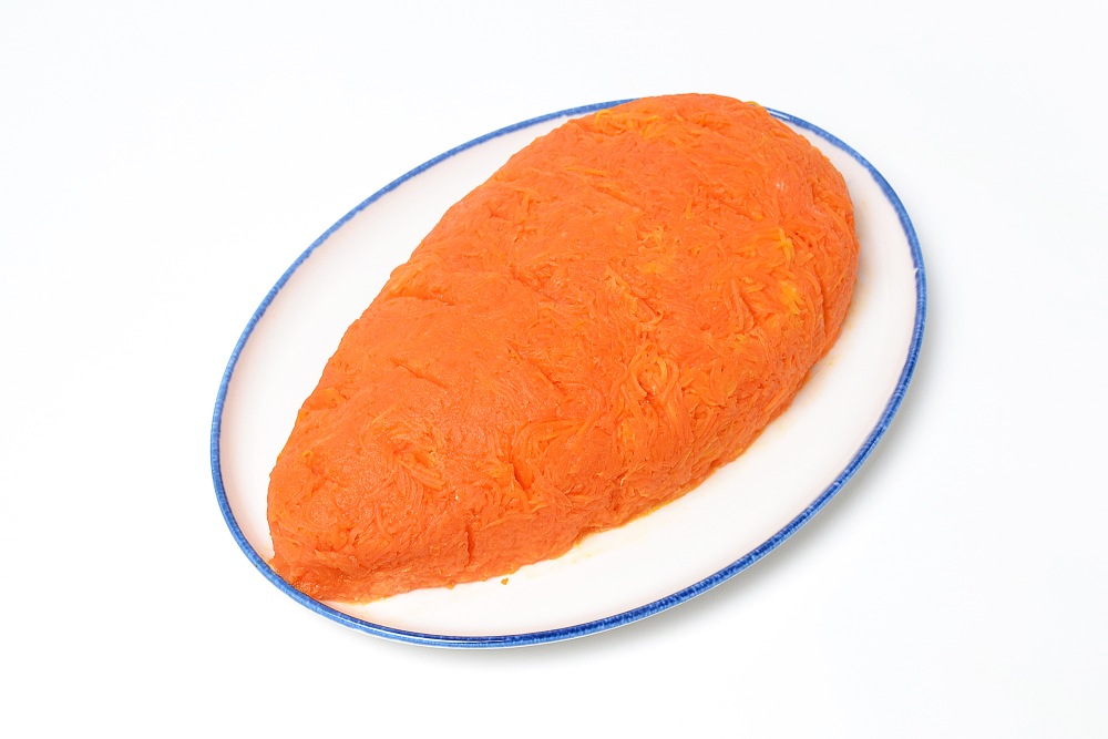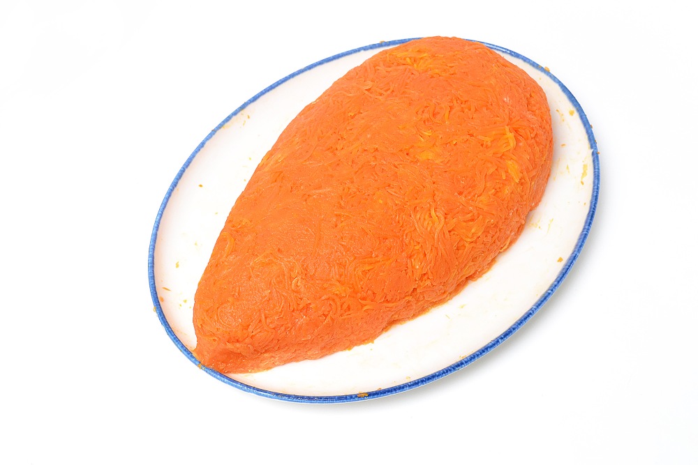 При формировании картофель утрамбовывайте по бокам и сверху, придавая ему форму моркови. Однако помните, что верхний слой из яиц и тертой моркови должен закрыть боковины. Поэтому немного отступайте место от краев, чтобы "носик" и задняя часть не вышли за границу.