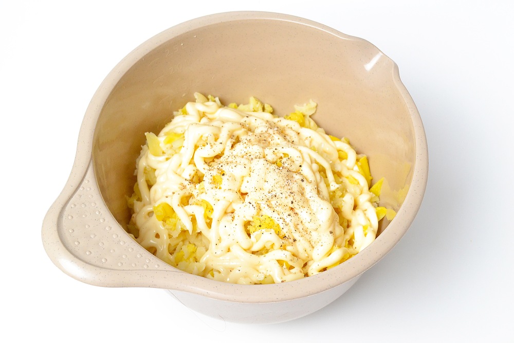 Картофель натереть на крупной терке, добавить половину майонеза, черный перец и 2-3 щепотки соли. Тщательно перемешать.