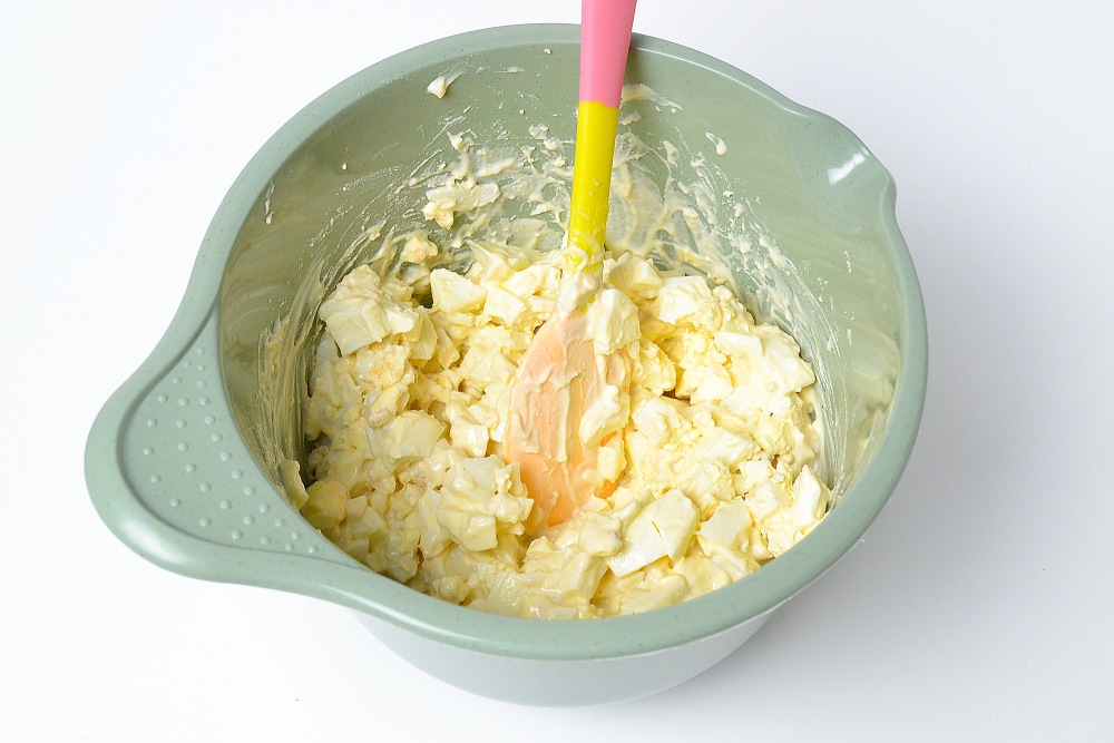 Яйца нарезать некрупным кубиком и смешать с оставшейся частью майонеза. Добавить 1-2 щепотки соли или по вкусу. Тщательно перемешать.