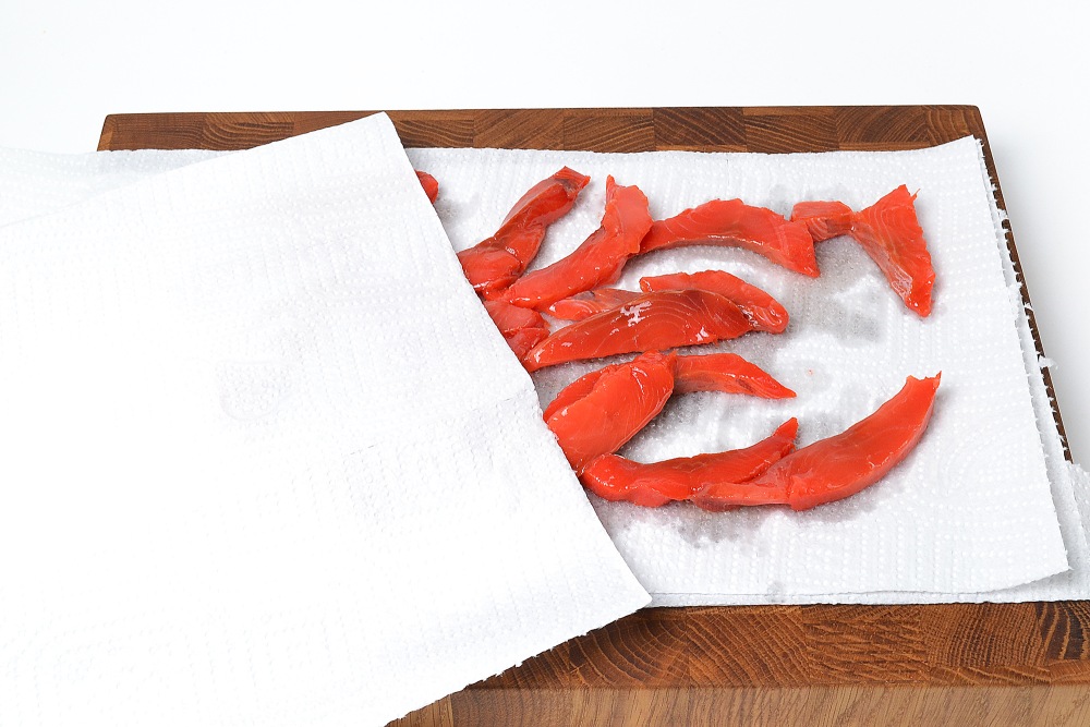 Красную рыбу достать из масла и обсушить бумажными полотенцами. Если используете крупные куски, удалите с них кожу и достаньте косточки.