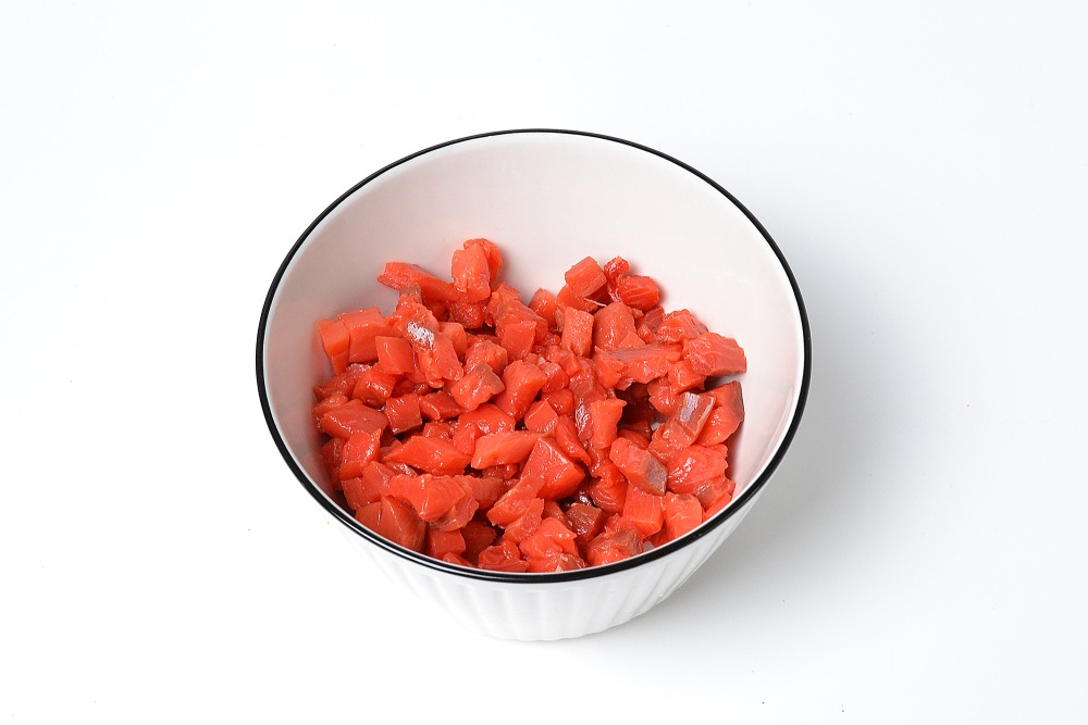 Подготовить ингредиенты. Главный вкус в праздничном салате «Морковка» на Новый год создает красная рыба. Можно взять слабосоленую семгу, форель, но не хуже получается и с кижучем, и с кетой. Подойдет даже горбуша. Выбирайте рыбу в масле, а не в маринаде с уксусом (будет кисло и не так вкусно).