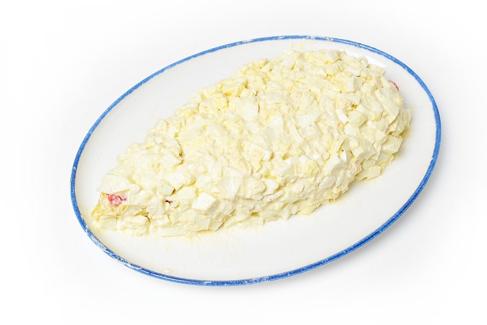 Кубиком нарезать яйца и смешать с оставшимся майонезом.