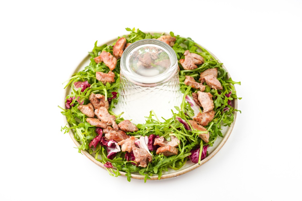 Взять большую плоскую тарелку, поставить в центр стакан или кулинарное кольцо. Выложить вокруг рукколу, слегка распределяя листья руками. Разложить сверху кусочки индейки, стараясь, чтобы они лежали равномерно и не сбивались в одну сторону.