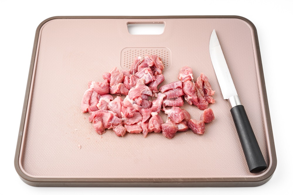 Промыть филе индейки под холодной водой, обсушить бумажными полотенцами, чтобы мясо хорошо обжарилось. Нарезать небольшими кусочками одинакового размера, чтобы они прожарились равномерно.