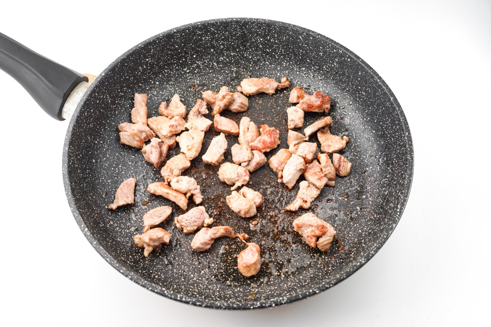 Следить, чтобы кусочки не пересохли, при необходимости убавить огонь. Готовое мясо переложить на тарелку и дать немного остыть.