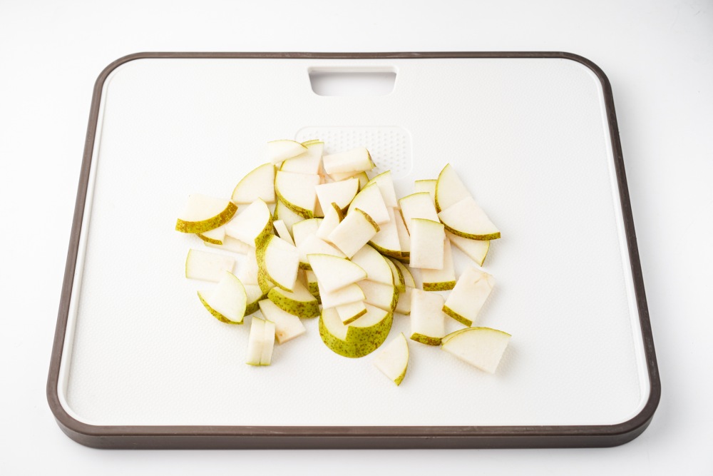 Промыть грушу, обсушить и разрезать пополам. Удалить сердцевину с семенами. Нарезать грушу средними кусочками или тонкими дольками - форма зависит от желаемой подачи. Если кожура жесткая, аккуратно снять ее ножом.