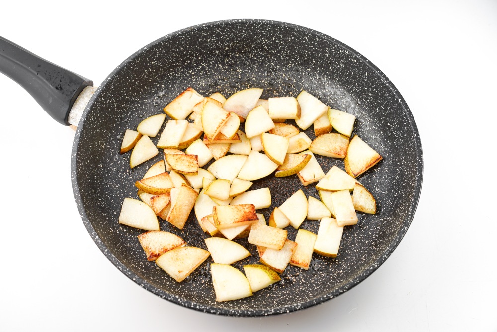Обжарить грушу на сливочном масле, добавить 1 ч.л. меда.