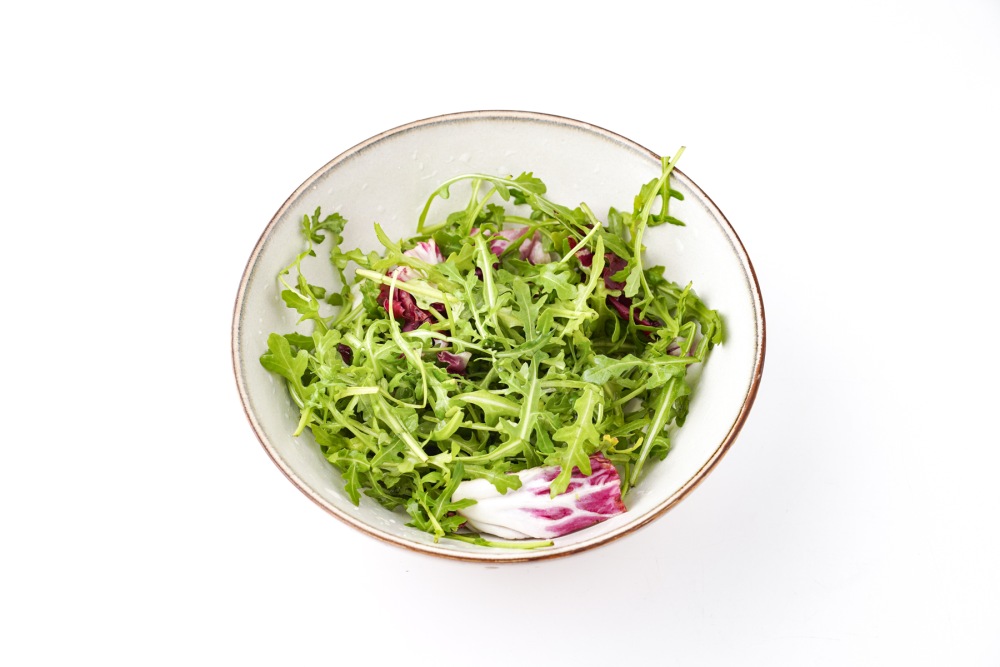 Тщательно промыть рукколу в холодной воде, обсушить с помощью салфеток. Листья должны быть полностью сухими, чтобы салат не «поплыл».
