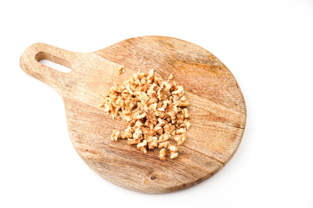 Промыть грецкие орехи, обсушить и порубить ножом на крупные кусочки, чтобы они чувствовались в салате и давали приятный хруст.