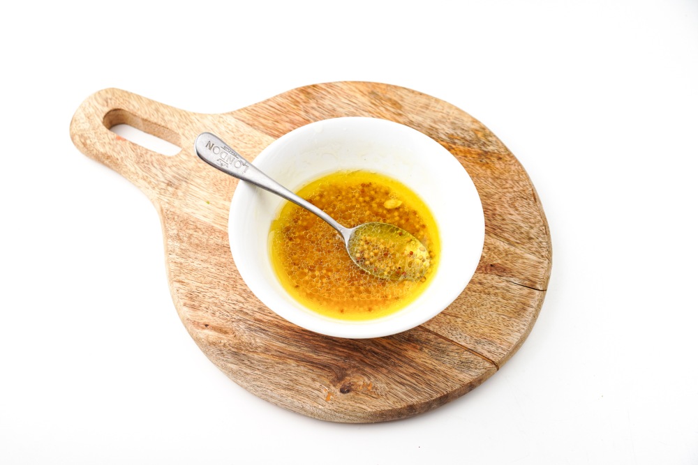 Сделать заправку. Соединить оливковое масло, мед, выжать сок половины лимона, добавить горчицу.