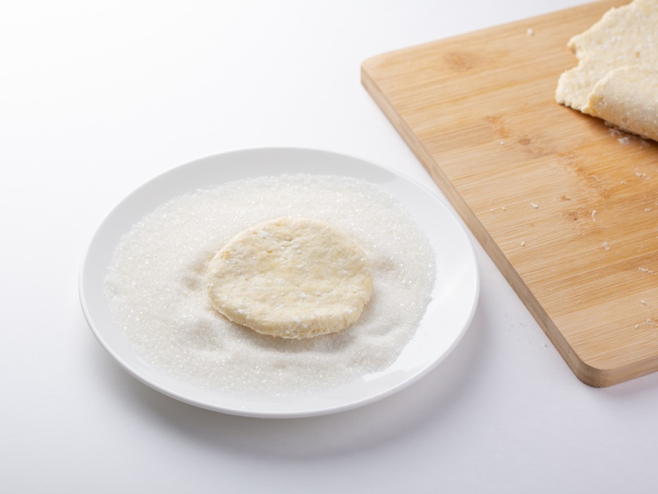 В тарелку насыпать сахар и положить туда кружочек теста.