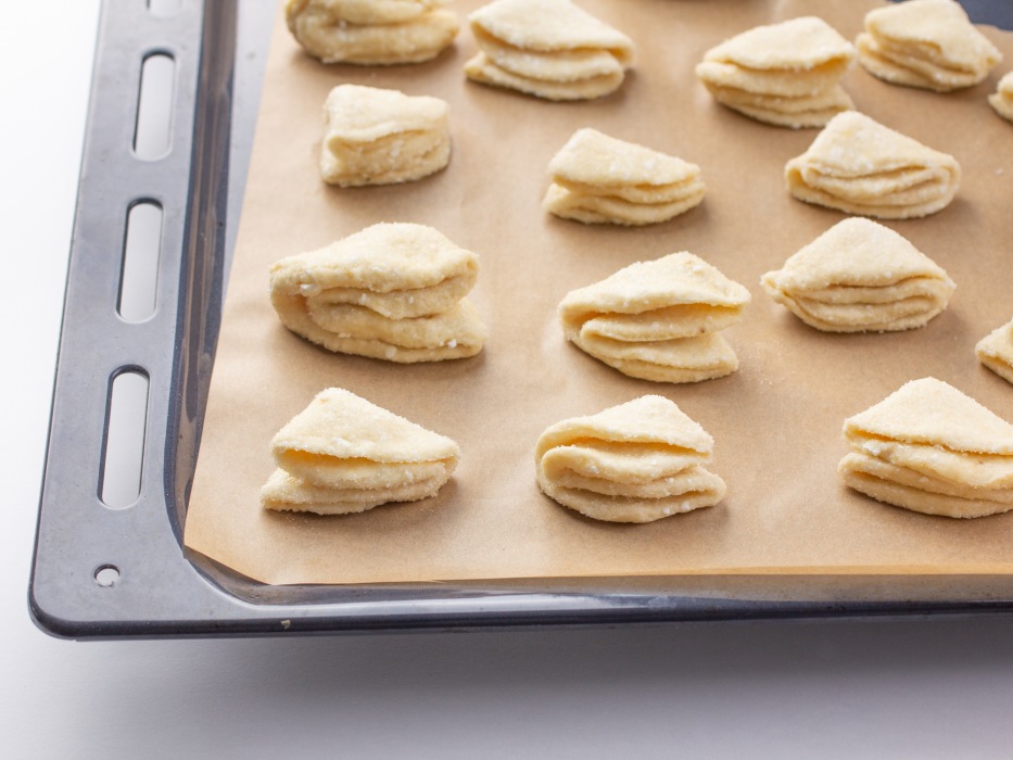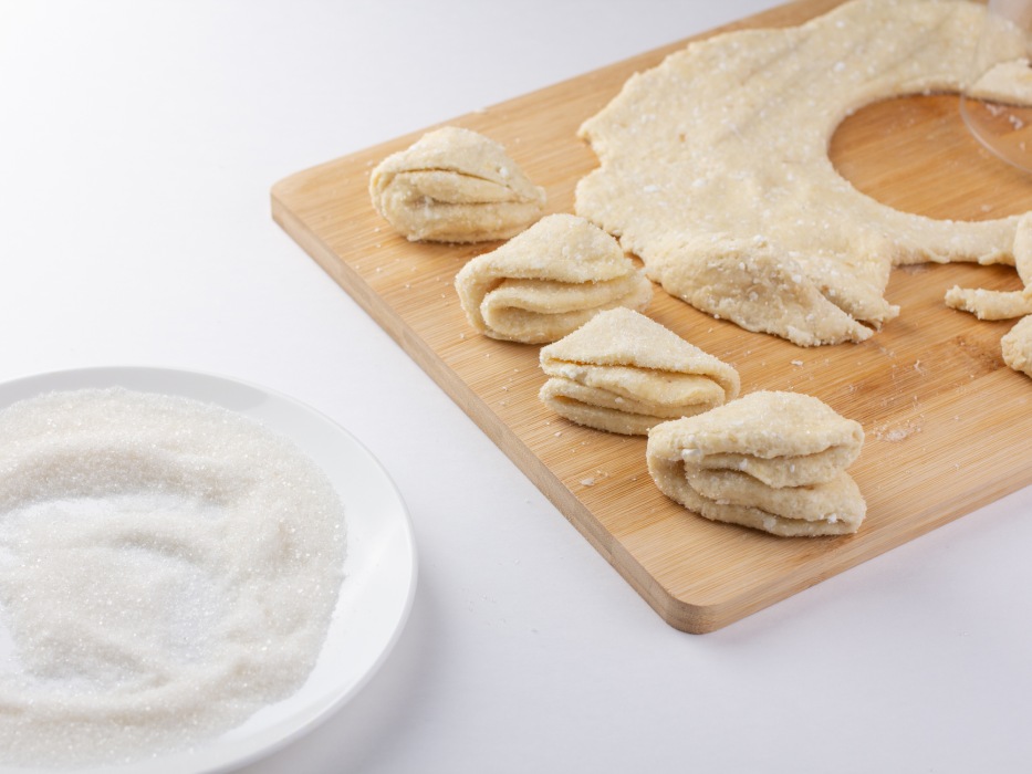 Сложить тесто пополам, чтобы сахар оказался внутри и еще раз обмакнуть в сахар, затем сложить кусочек еще раз пополам. Сахар должен быть со всех сторон печенья.