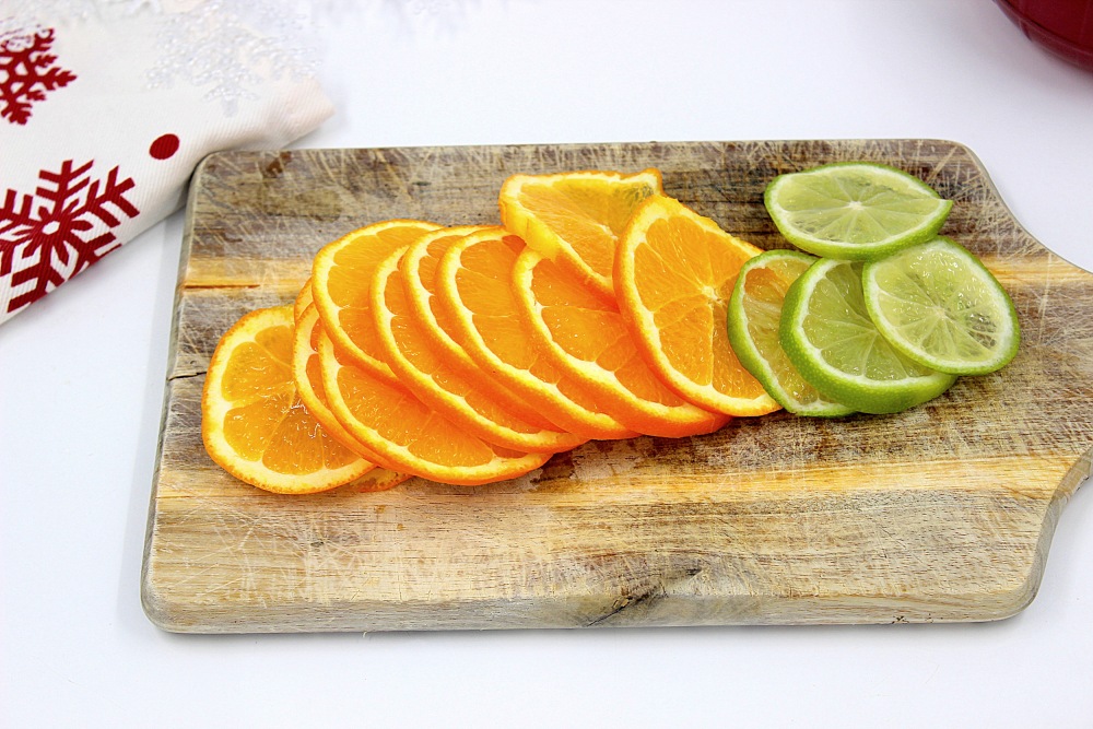 Тонкими кружочками нарезать апельсин и половину лайма.