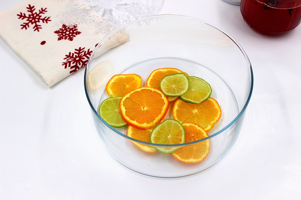 В большую, стеклянную чашу выложить половину кружков апельсина и лайм.