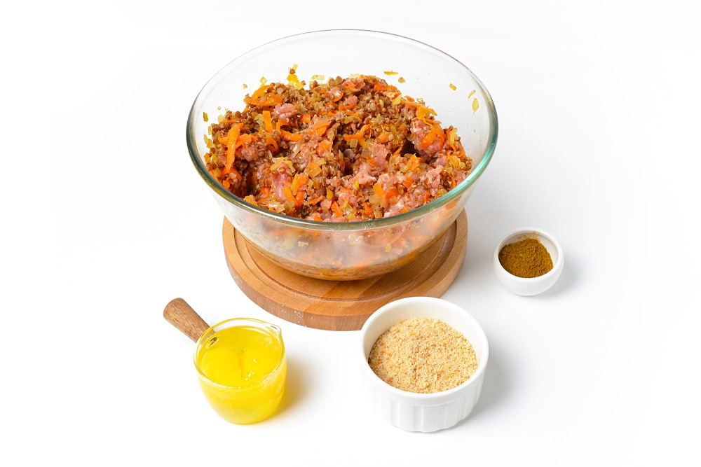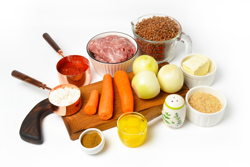 Подготовить ингредиенты: сваренную гречку, фарш, яйца, лук и морковь, сухари, приправы, а также томатную пасту, муку, сливочное масло для соуса.