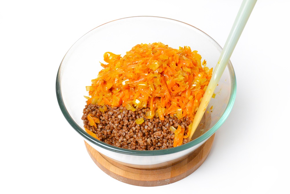 Гречку следует отварить заранее и остудить. Воды берите меньше, чем нужно: на пару – 200 г на 200 г гречки, на плите – 300 г на 200 г гречки. Она должна получиться слегка суховатой.