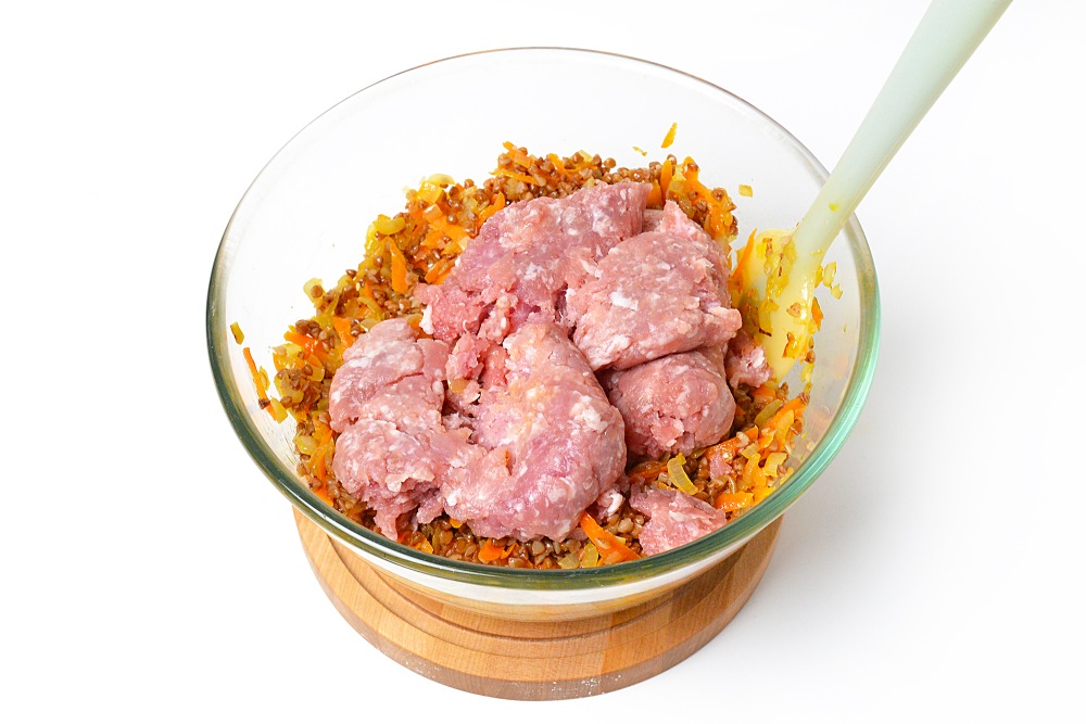 Добавить фарш и тщательно перемешать, можно вымешивать руками – так удобнее всего.