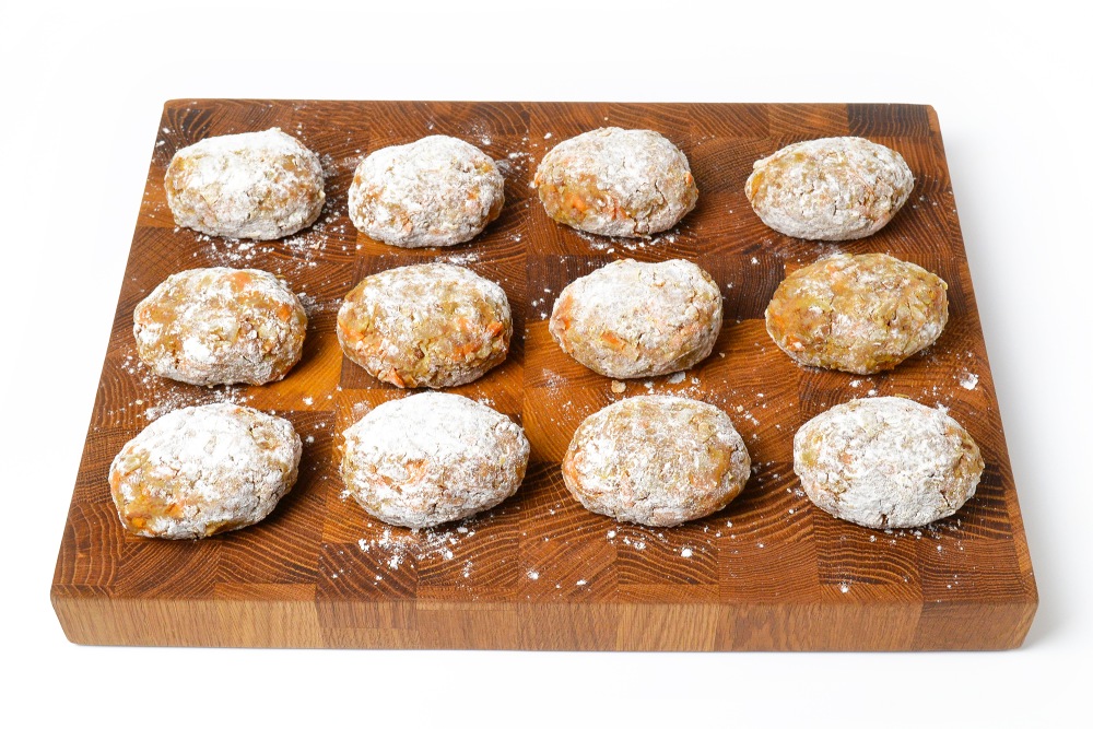 Сформировать гречаники весом примерно по 100 г и обвалять в муке. Удобнее всего сформировать сразу же все котлетки и выложить их на доску или рабочую зону, присыпанную мукой.
